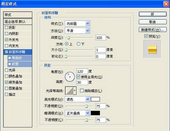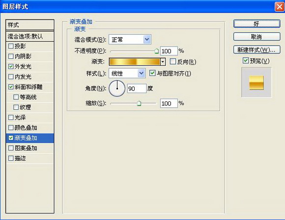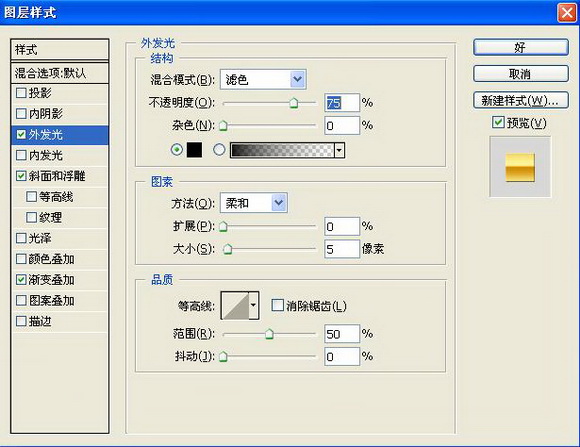 9、双击图层2,在弹出的图层样式对话框中选择“外发光”“斜面和浮雕”“渐变叠加”样式,其中设置外发光的颜色为黑色,在渐变叠加面板中的渐变编辑器中设置色标依次为黄色RGB分别为157、157、161,浅黄色RGB255、245、150,黄色RGB210、140、0,浅黄色RGB255、245、150,黄色RGB210、140、0,如图13-15所示,图像效果如图16所示。