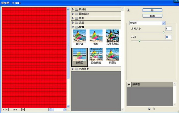 13、选择背景图层,执行菜单栏中的“滤镜”“纹理”“拼缀图”命令,在弹出的对话框中设置参数如图22所示,图像效果如图23所示。