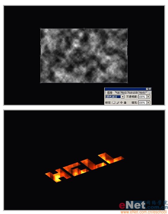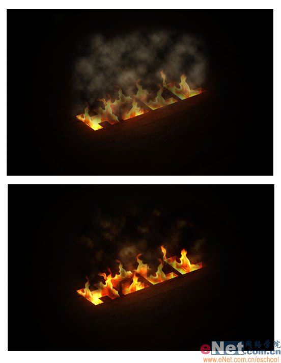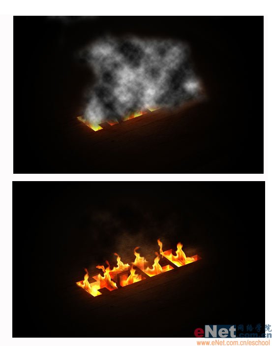 16.现在我们来制作火焰中的烟雾。按D键将前景色和背景色复位为白色和黑色。在文字层上再建立一新图层并执行滤镜-渲染-云彩,然后用橡皮工具修去一些多余的部分。