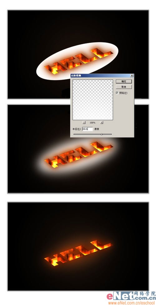 11.建立一个新图层,用椭圆选框工具在文字层中建立一个椭圆选区并用白色填充。然后用高斯模糊滤镜进行模糊处理,数值设置为70像素。然后改变图层混合模式为叠加。