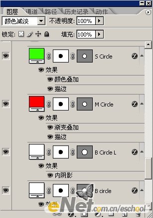 3.重复第1.2步骤用椭圆选框工具另外建立2个图层将2个图层的颜色分别设置成为绿色和红色。将这个2个图层分别重命名为M CircLe和S CircLe。