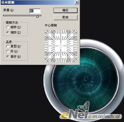 15.执行滤镜-模糊-径向模糊,设置如下。下面再次按住CTRL 点击Screen层载入其选区,然后回到云彩层上执行图层-图层蒙版-显示选区。