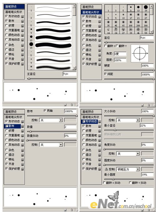 16.下面我们来制作一些星星。建立一新图层并用黑色填充再重命名为B Stars,设置图层混合模式为颜色减淡。之后选择画笔工具对其做一下设置在图中编辑出如下所示的星星。
