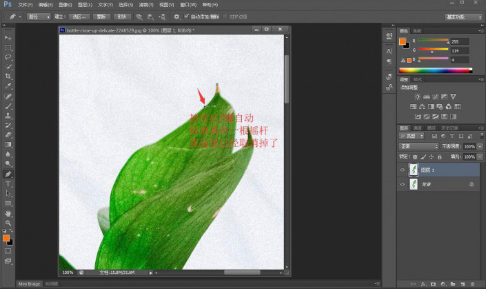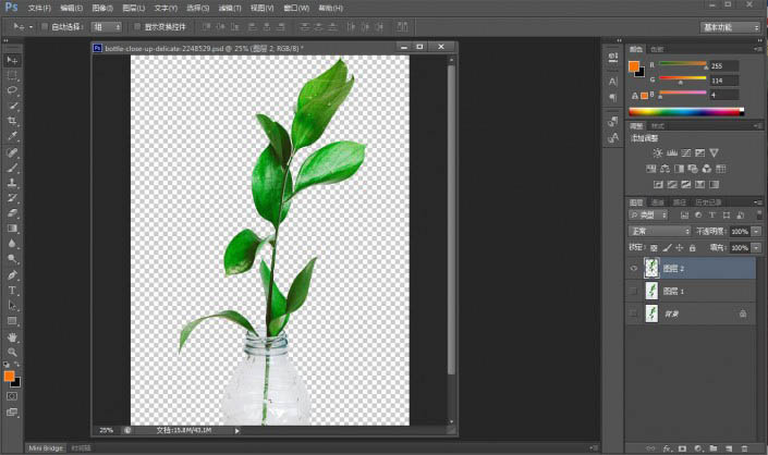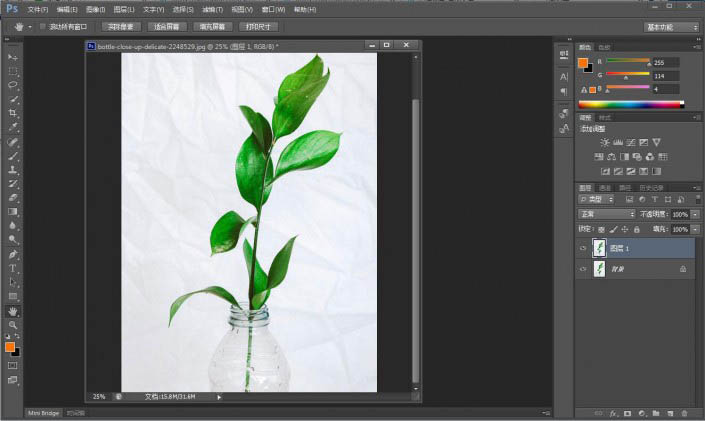一、打开图片,复制一层,这里我选择了一个植物的图片,我们现在要把植物和瓶子用钢笔工具全部抠出来