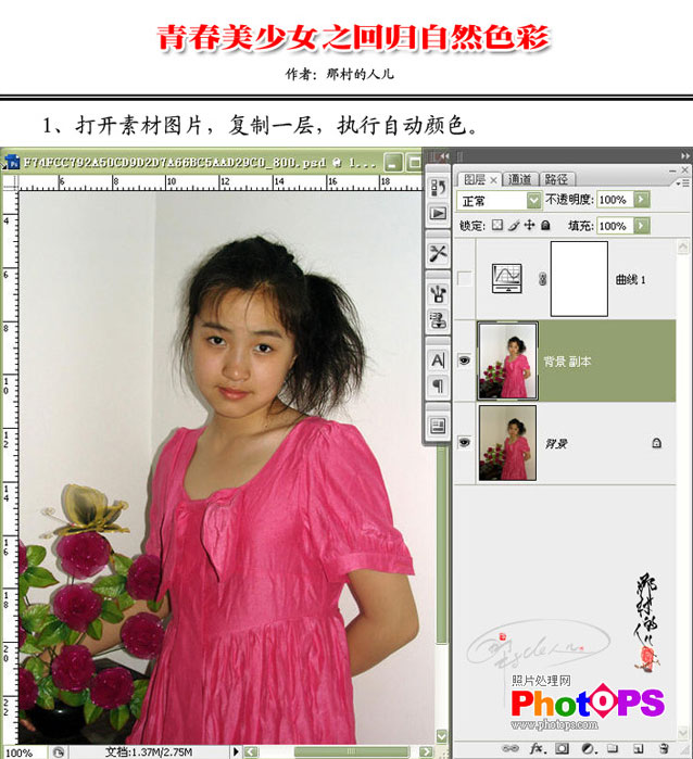 PhotoShop为青春美少女之回归自然色彩,也是一个不错的照片美化教程。 相关Photoshop教程文章:Photoshop对人物脸部美白及磨皮教程 原图 效果图 副标题 教程: 1 2 副标题 3 4 副