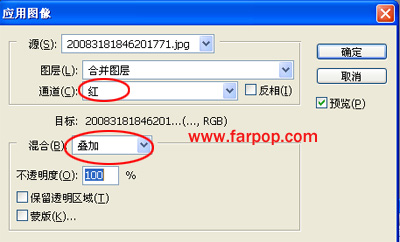 2、图像-调整-应用图像,通道红色,混合模式为叠加;
