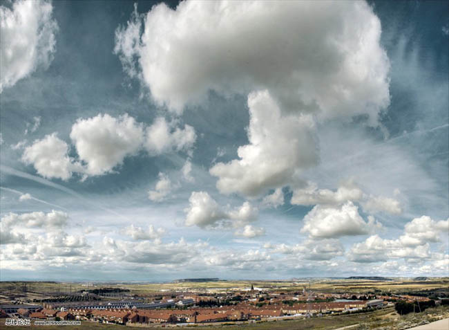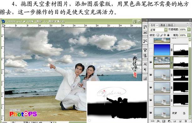 4、拖进天空素材图片,加上图层蒙版,用黑色画笔把不需要的地方擦掉,这一步目的是使天空充满活力。
