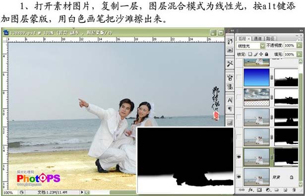 1、打开原图,复制一层把图层混合模式改为“线性光”,按Alt键加上图层蒙版,用白色画笔把沙滩擦出来。