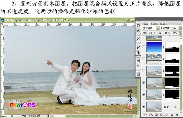 2、复制背景副本图层,把图层混合模式改为“正片叠底”,适当的降低图层的不透明度。这两步的操作是强化沙滩的色彩。
