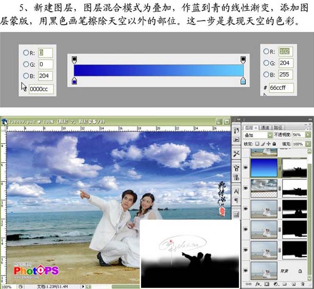 5、新建一个图层,图层混合模式改为“叠加”,做蓝到青的线性渐变,加上图层蒙版,用黑色画笔把除填充以外的部位擦掉。