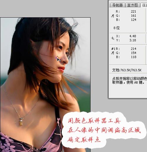1、用颜色取样器工具在你像的中间调偏高区域,确定取样点。