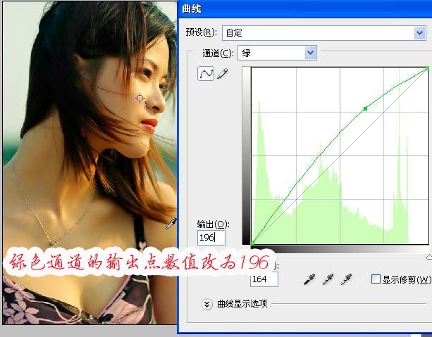 3、在调绿色通道,绿色通道的输出点数值改为196。