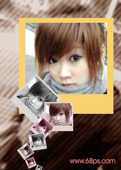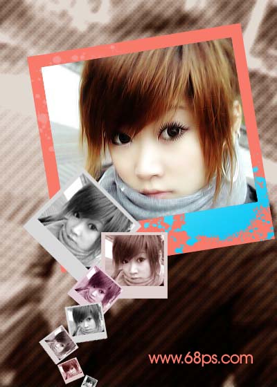 6、把大像框适当改变下色调,加点笔刷效果,并整体移动一下角度,大致效果如图7。
