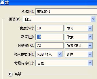 1、新建一个10 * 10像素的文件,新建参数设置如下图。