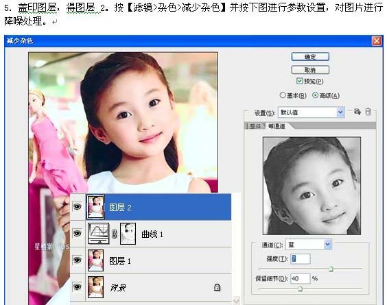 5、新建一个图层,盖印图层,得到图层2。执行:滤镜 > 杂色 > 减少杂色,参数设置如下图,对图片进行降噪处理。