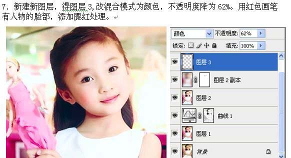 7、新建一个图层,把图层混合模式改为“颜色”,图层不透明度改为:62%,用红色画笔在人物的脸部涂出腮红。