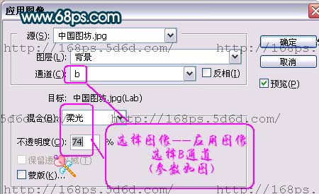 3、选择菜单: 图像 > 应用图像,参数设置如下图。