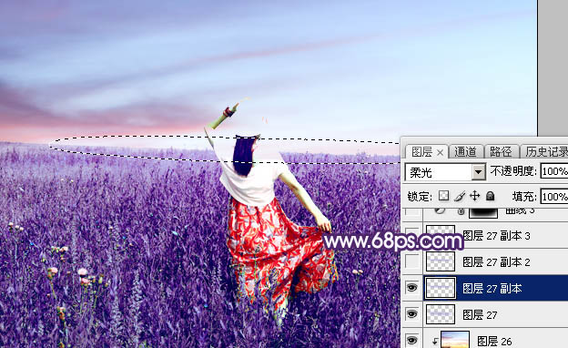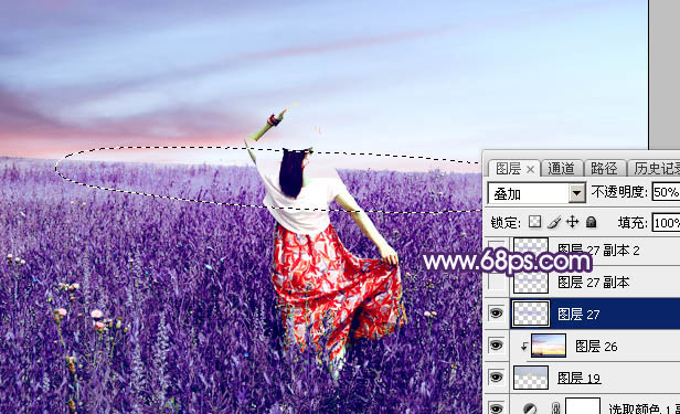 14、新建一个图层,用套索工具勾出下图所示的选区,羽化45个像素后填充淡紫色:#ADA1D8,取消选区后把混合模式改为“叠加”,不透明度改为:50%,效果如下图。