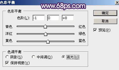 7、创建色彩平衡调整图层,对阴影,高光进行调整,参数设置如图10,11,效果如图12。这一步给图片增加淡红色。