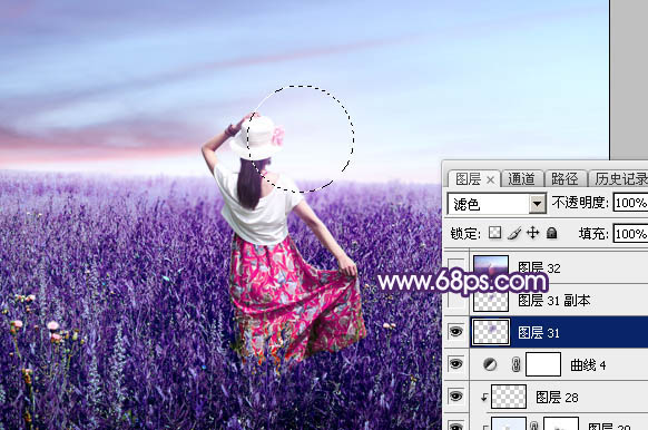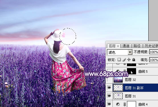 25、新建一个图层,用椭圆选框工具拉出下图所示的选区,羽化35个像素后填充蓝紫色:#7441A4,取消选区后把混合模式改为“滤色”,如下图。