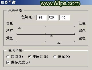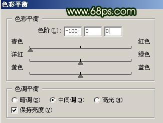 1.打开原图按Ctrl J 复制一层,按Ctrl B 调色彩平衡参数设置如图1,确定后把图层混合模式改为“强光”,效果如图2