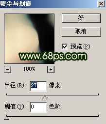 6.新建一个图层按Ctrl Shift Alt E,盖印图层,然后执行菜单:滤镜 > 杂色 > 蒙尘与划痕,参数设置如图9,确定后再把图层混合模式改为“ 叠加”,图层不透明度改为:50%,效果如图10。