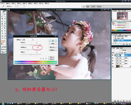4、执行色相饱和度,值为-27(呵呵,下面打错了一个字,‘曲线’打成‘曲张’了。