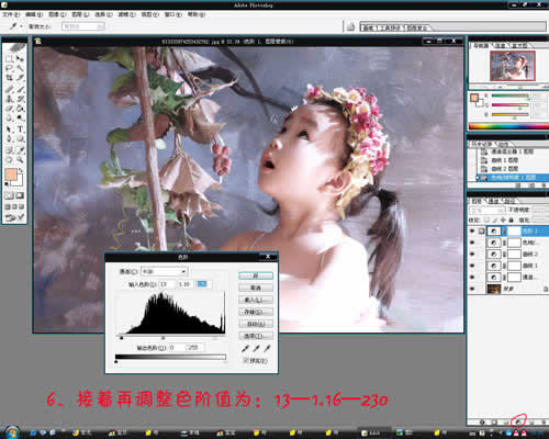 6、调整色阶值为13,1。16,230