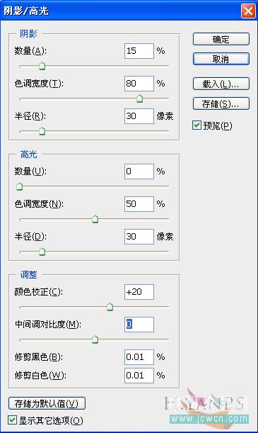 第二步:调出图像的细节 【图像】【调整】【阴影高光】 这个功能用来调色也是非常不错的方法.既提亮了暗部又可以对色彩增加饱和度.而一般情况下对细节也是无损的. 这也是我常用的方法..
