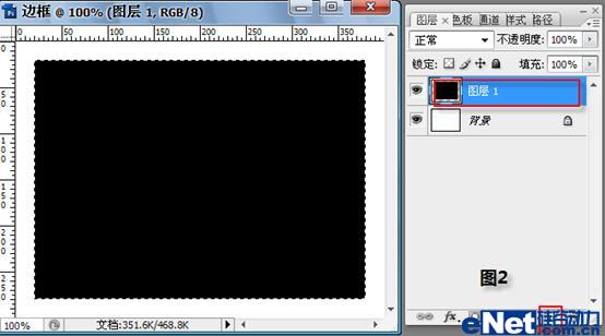 第八步:用矩形选择工具,做一个比“图层一”的黑色矩形稍大的选区,如图9所示。按“Ctrl Shift I”反选,再按“Delete”键删除多余内容。