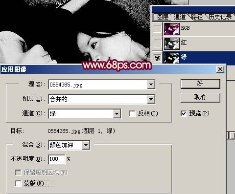 1.打开原图,点通道面版,选择绿色通道,执行菜单:图像 > 应用图像 参数设置如图1,确定后回到图层面版效果如图2。