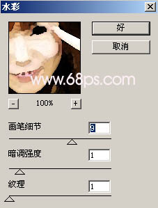 1、打开原图,按Ctrl J复制一层,执行菜单:滤镜 > 艺术效果 > 水彩,参数设置如图1,确定后加上图层蒙版把人物部分擦出来,效果如图2。