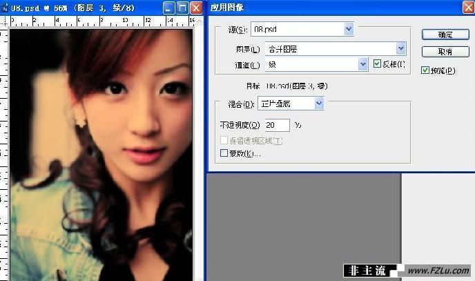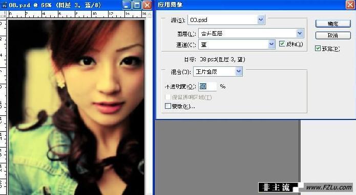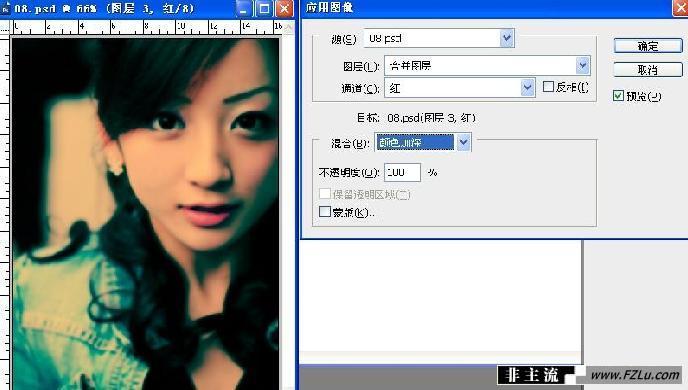 6、选中绿色通道,选中蓝色通道,图像-应用图像,设置如图