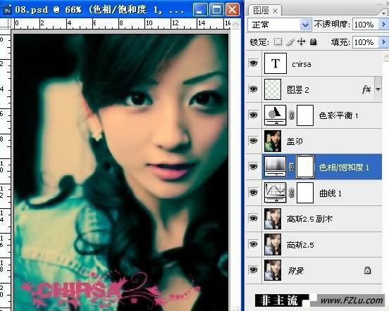 3、建立“曲线”、“色相/饱和度”调整层,调整到自己满意