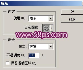 3.新建一个图层按Ctrl Shift Alt E盖印图层,按Ctrl U 调色相/饱和度参数设置如图5,确定后新建一个图层执行菜单:编辑 > 填充参数设置如图6图案是PS自带的如果你没有安装可以直接用图7。效果如图7,把图层混合模式改为“变暗”,加上图层蒙版把人物部分擦出来效果如图8