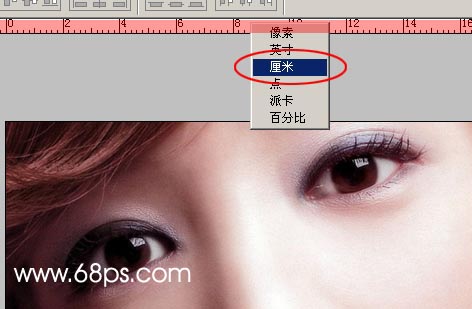 1.打开原图按Ctrl R调出标尺如下图在标尺的位置按鼠标右键就可以选择单位了,然后选择厘米。也可以自己定义!
