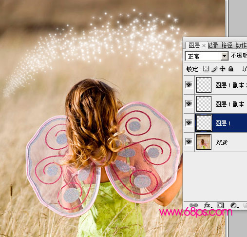 6.打开原图素材,选择刚才定义好的画笔,前景颜色设置为白色,由女孩子右手星星的位置开始涂抹,按住鼠标不要放有星星到左边一次画完效果如图11