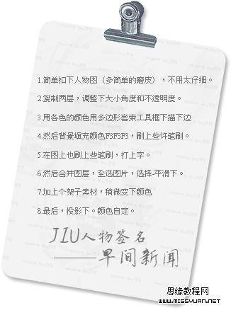 本教程简单介绍人物签名效果制作,教程中没有用到太多的素材,简单用一个架板做底图,然后加上人物,笔刷及文字。