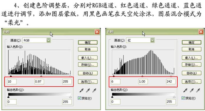 4.创建色阶调整层,分别对RGB通道、红色通道、绿色通道、蓝色通道进行调节,添加图层蒙版,用黑色画笔在天空处涂抹,图层混合模式改为“柔光”。