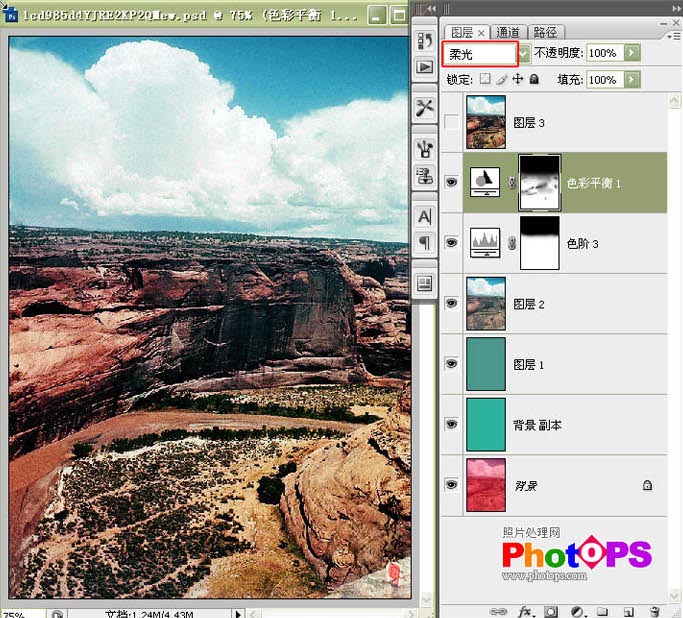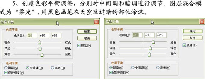 5.创建色彩平衡调整,分别对中间调和暗调进行调节。图层混合模式改为“柔光”,用黑色画笔在天空及过暗的部位涂抹。
