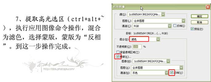 7.按Ctrl Alt ~提取高光选区,执行应用图像命令操作,图层混合模式改为“滤色”,选择蒙版,蒙版为“反相”,完成最终效果。