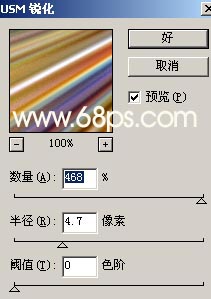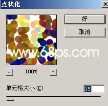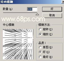 2.按Ctrl J把刚才得到的分层后的图层复制一份,执行菜单:滤镜 > 像素化 > 点状化,参数设置如图2,确定后执行菜单:滤镜 > 模糊 > 径向模糊,参数设置如图3,确定后再按Ctrl F三次,然后再执行菜单:滤镜 > 锐化 > USM锐化参数设置如图4,效果如图5