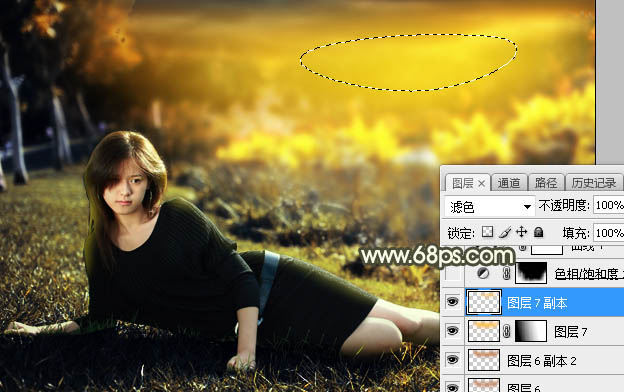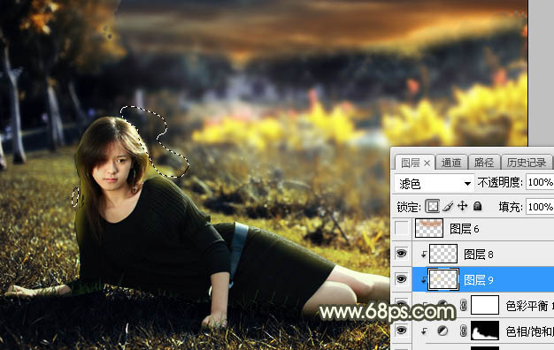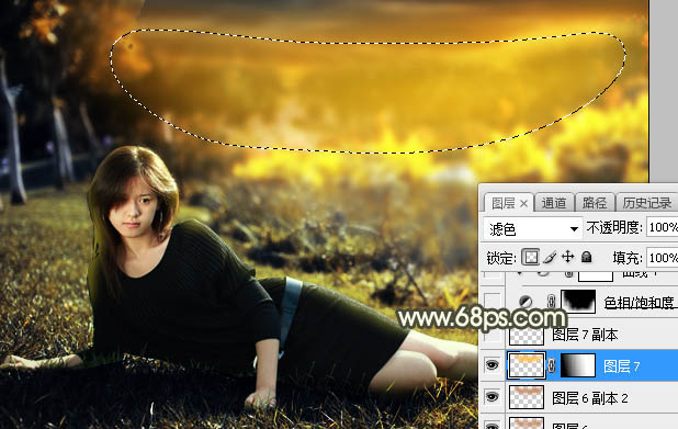 18、按Ctrl + J 把当前图层复制一层,锁定像素区域后填充橙黄色:#FFC103,确定后把混合模式改为“滤色”,添加图层蒙版,用柔边黑色画笔把过亮的部分涂暗一点,如下图。