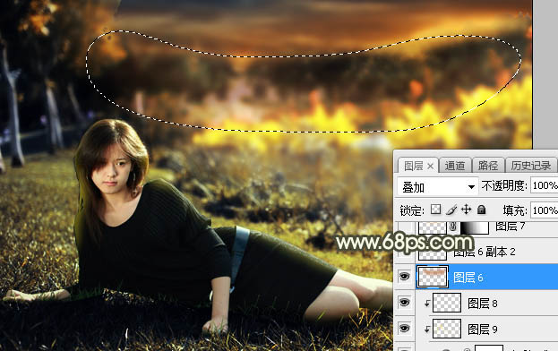 16、新建一个图层,用套索工具勾出下图所示的选区,羽化40个像素后填充红褐色:#C47D34,取消选区后把混合模式改为“叠加”,效果如下图。