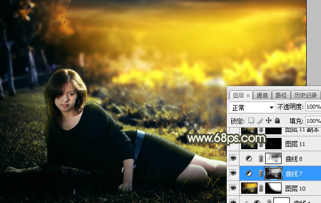 素材图片背景非常杂乱,处理的时候可以把背景适当模糊处理;然后把主色转为暖色,天空部分增加霞光素材;再把整体大幅压暗,局部渲染一些暖色高光即可。