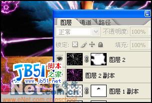 选择图层2,单击“添加图层蒙版”,使用200像素的柔边画笔在蒙版上涂抹,隐藏部分闪电效果。