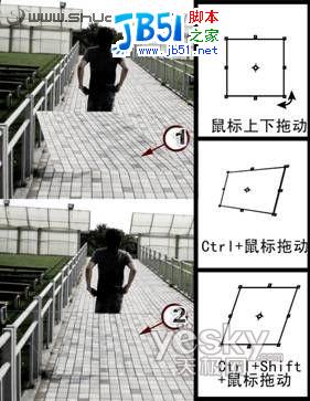 2.把新的图层盖在人物上方,可以看到,因为两侧的透视关系不对(图2左侧所示),瓷砖无法对按。我们可以按快捷键“Ctrl+T”,对它进行自由变换。按下“Ctrl”键,用鼠标拖动变换框的角点,将瓷砖的缝对齐。(图2右侧所示)