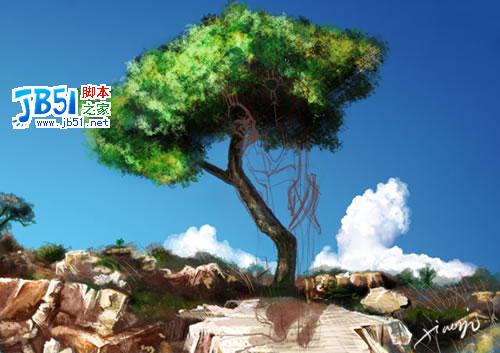 | 4. 刻画岩石。用颗粒感的笔刷表现出岩石 和远处的树木。注意光影关系和透视关系,远处的可以随意点,模糊些,但不要以为模糊就不加思索的涂。注意岩石的质感表现,笔触硬朗些。 |