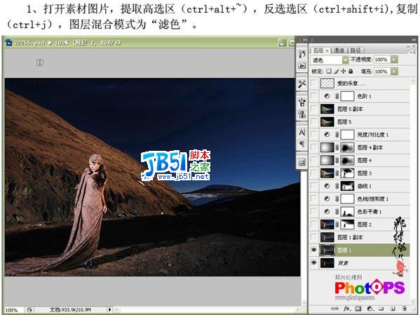 | 1.打开素材图片,按Ctrl + Alt + ~提取高光选区,按Ctrl + Shift + I 反选,按Ctrl + J复制把图层混合模式改为“滤色” |