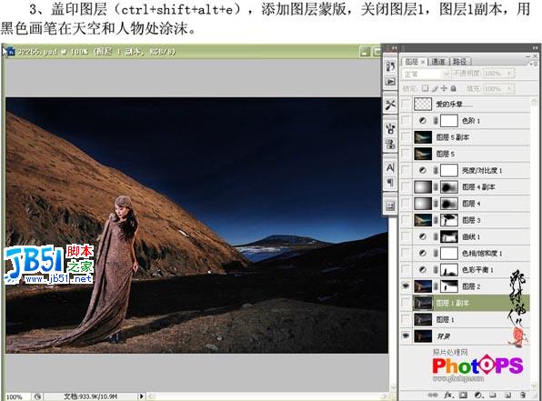 | 3.按Ctrl + Shift + Alt + E盖印图层,添加图层蒙版,关闭图层1,图层1副本,用黑色画笔在天空和人物处涂抹 |